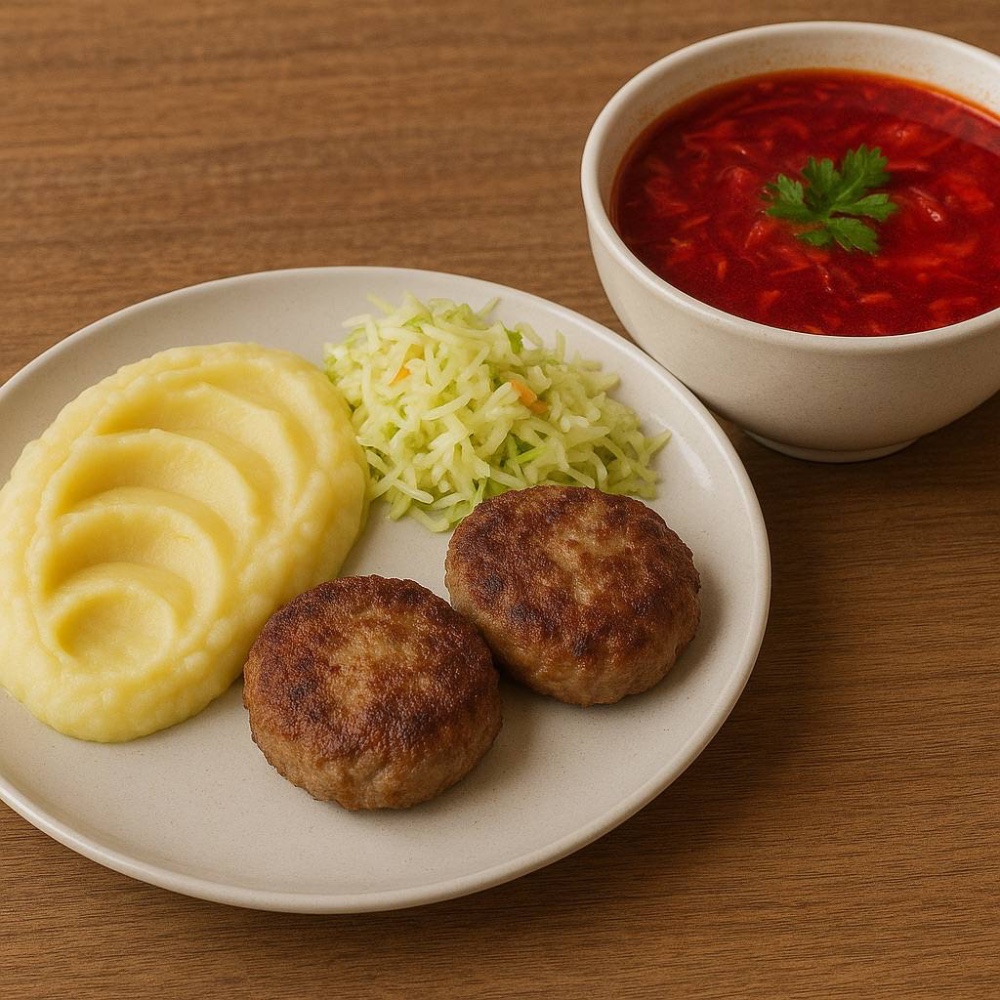 Борщ домашній, ланч з двома котлетками по-харківськи, пюре та салатом з капусти