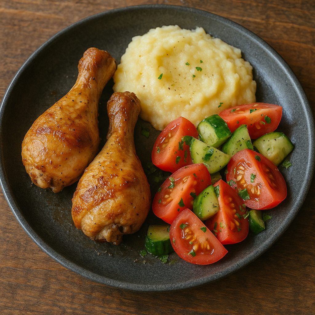 Дві курячі ніжки, пюре з вершковим маслом та зеленню, салат з помідорів та огірків.130/100/70