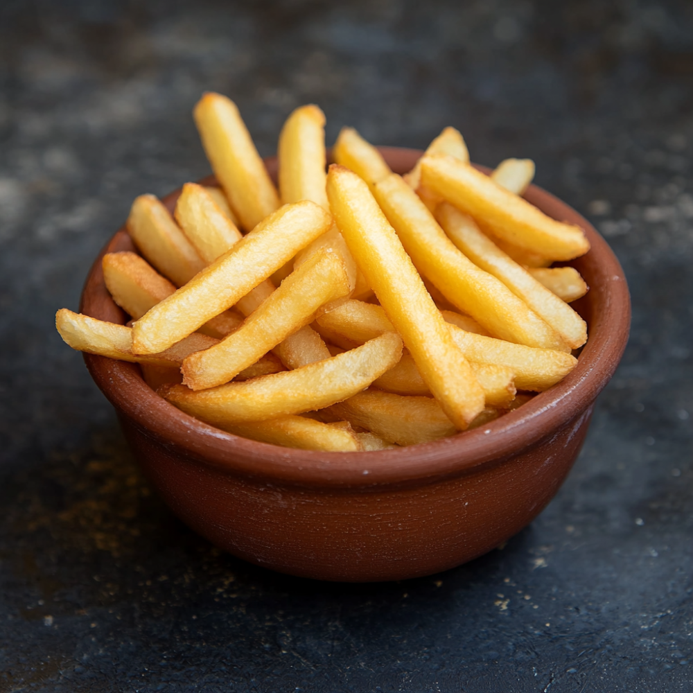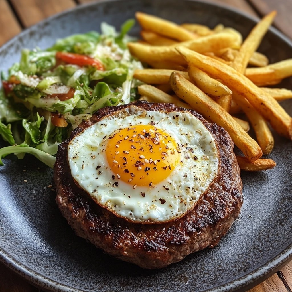 Біфштекс з яйцем, картоплею-фрі, салатом з капусти, моркви, зелені та часникового соусу