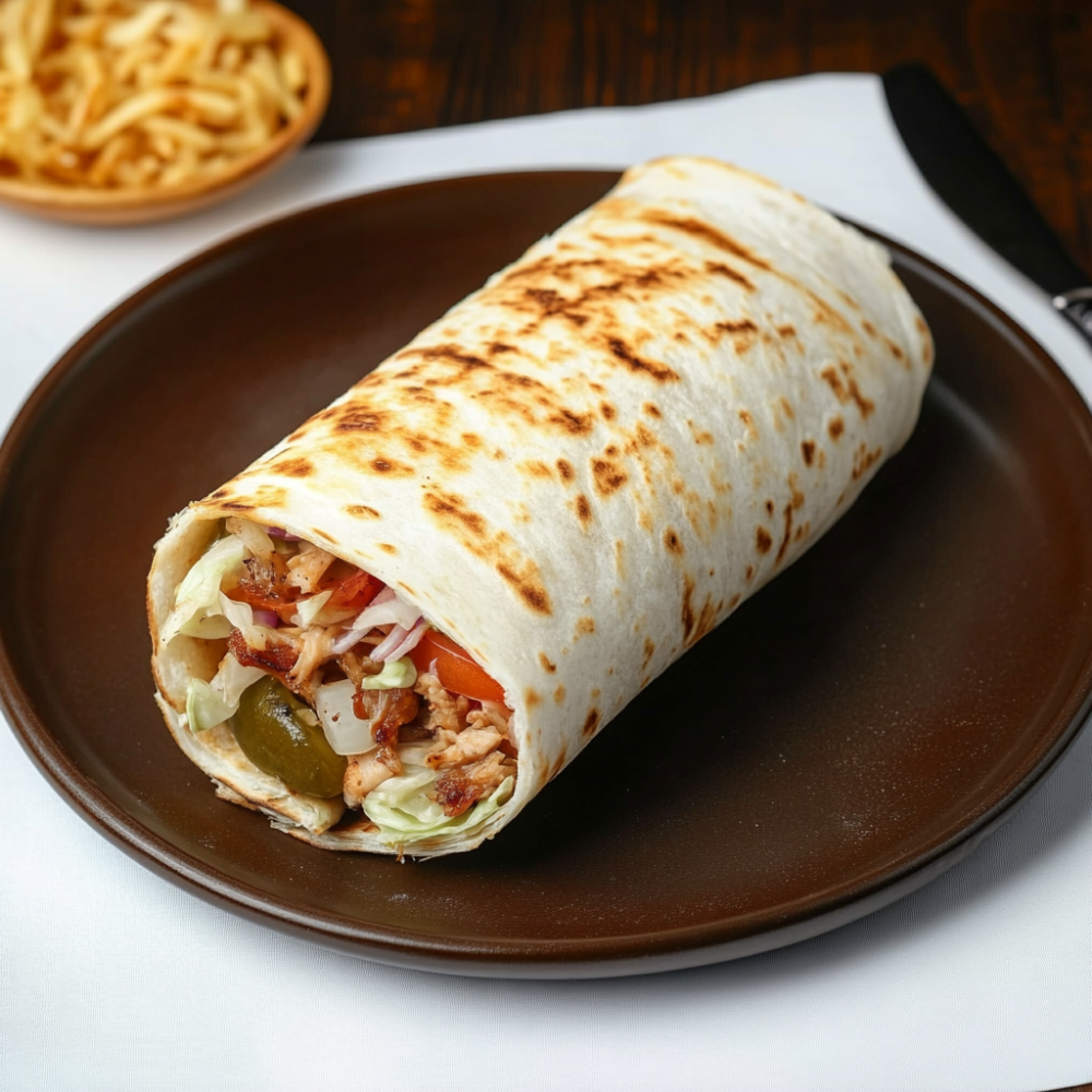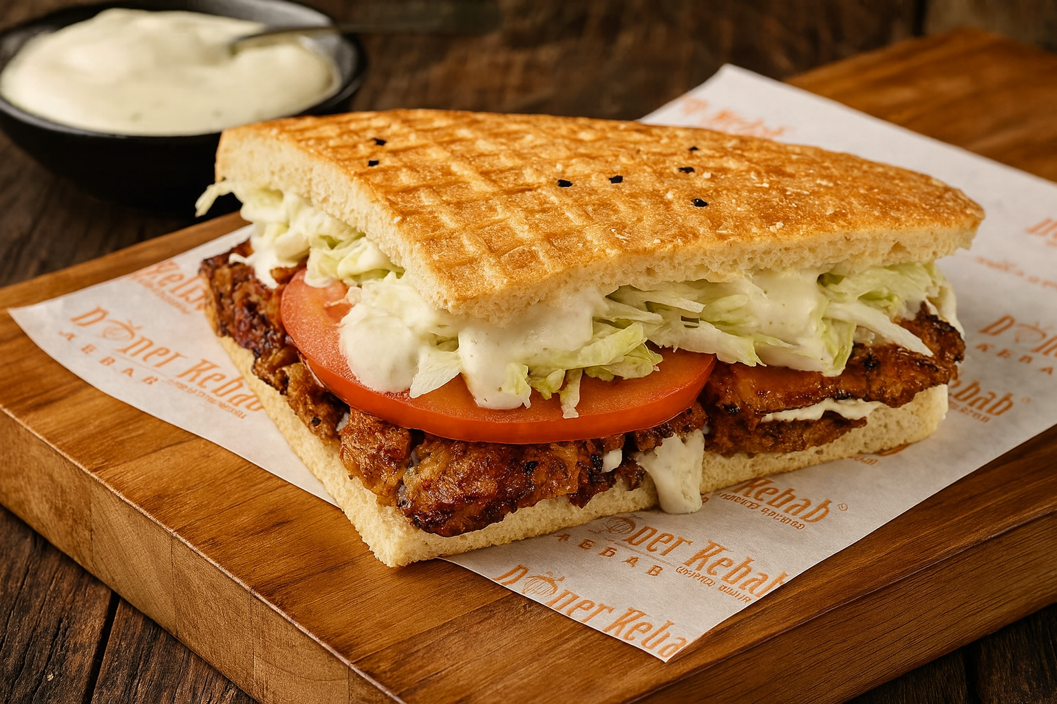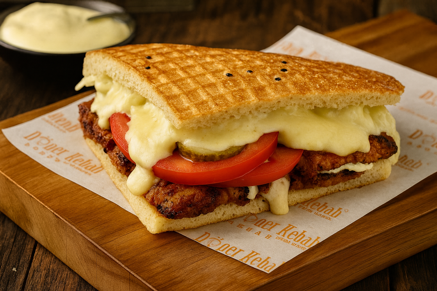 Донер з куркою, томатом, маринованим огірком, пекінською капустою, міксом домашніх сирів та соусами сирним та солодким чилі
