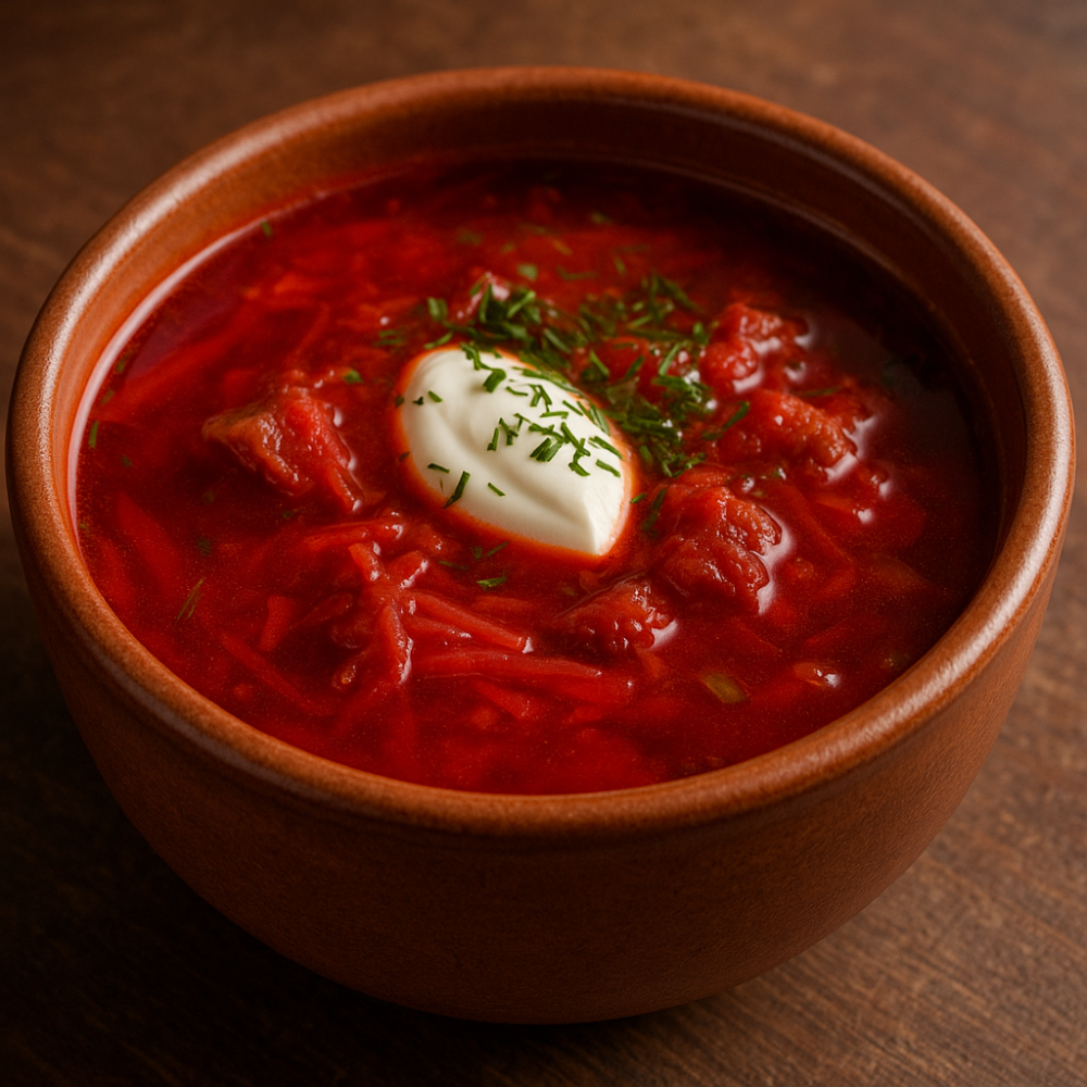 Український борщ із мʼясом, подається зі сметаною та укропом.