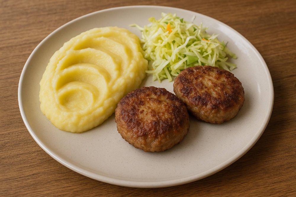 2 курячо-свині котлетки, пюре та салат з капусти.130/100/70