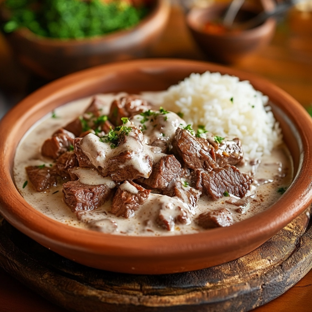 Телятина у вершковому соусі на подушці з рису з додаванням зелені, 300 г