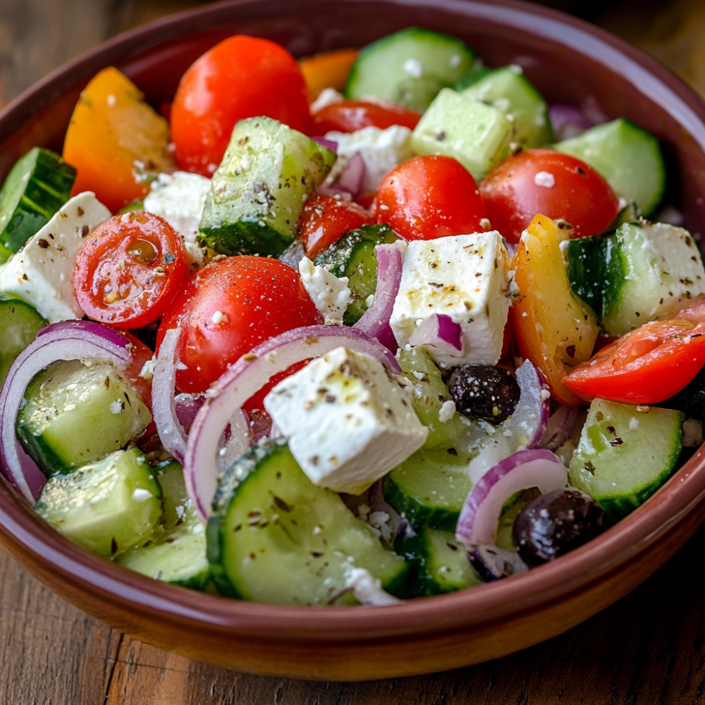 Шматочки свіжого томату, червоної цибулі, солодкого перцю, огірка, маслини, фети, 200 г